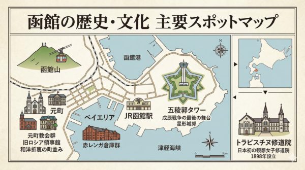 | 五稜郭(ごりょうかく) | 珍しい星形の城郭(じょうかく)。戊辰戦争(ぼしんせんそう)の最後の舞台。 | 日本の武士(ぶし)の時代の終わりを象徴する場所です。 |