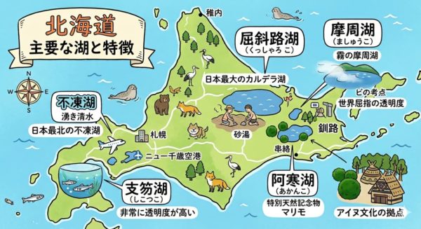 | 阿寒湖(あかんこ) | 特別天然記念物の「マリモ」で有名。アイヌ文化の拠点でもあります。 |