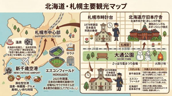 | 大通公園 | 札幌中心部を貫く公園。さっぽろ雪まつりのメイン会場。 | 元々は街の延焼を防ぐための「火除け地(ひよけち)」でした。❄️ |