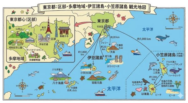 東京都の地理を語る上で欠かせないのは、その「多様性」です。都心部の23区だけでなく、自然豊かな多摩地域、そして南に1,000kmも離れた小笠原諸島(おがさわらしょとう)までが含まれます。