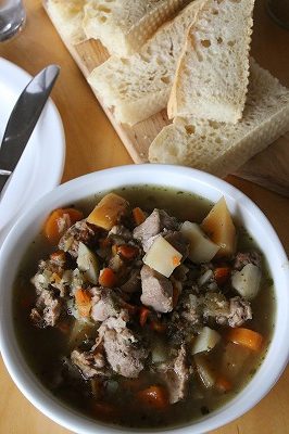 肉が柔らかくなったら野菜を加え更に煮込みます。野菜はニンジン、ジャガイモ、玉ねぎ、ヨーロッパ原産のカブなどを使います。全ての材料が柔らかくなったら出来上がり。食べる前に肉を取り出して、骨や筋、脂肪を取り除いてから食べやすい大きさにカットしてスープに戻します。