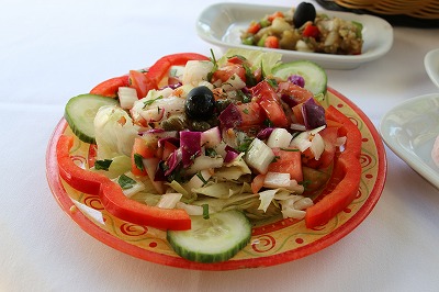 ギリシャでサラダと言えば一般的にホリアティキサラタ (Horiatikisalata / χωριάτικη σαλάτα) を意味します。小さくカットしたトマト、キュウリ、ピーマン、オリーブの実、玉ねぎのサラダで、フェタチーズがどーんと一枚トッピングされる事が多いです。