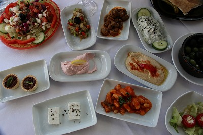 ギリシャ料理と言えば、メゼ (Mezze) と呼ばれる前菜的な小皿料理が有名です。ギリシャ料理の楽しさは、このメゼの存在につきると思うので、机一杯に沢山のメゼを注文して並べましょう。