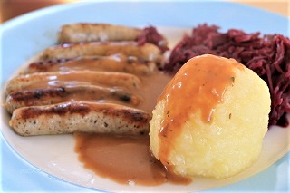 ドイツの北西部ではクロース(Kloß)と呼び、ドイツの南東ではクネーデル (Knödel)と呼ばれるジャガイモ団子です。茹でたジャガイモと固くなったパンをこねて丸めて団子にして茹でます。