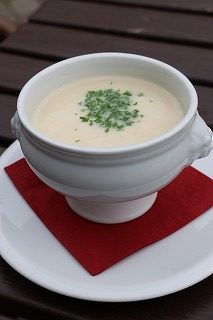 ジャガイモのスープをカルトッフェルズッペ (Kartoffelsuppe)と呼びます。スープと言うか具沢山のシチューで、ドイツの冬の定番料理です。前菜に頼むとメインが食べれなくなる量なので注意しましょう。ドイツはパンが美味しいのでスープとパンだけでも充分満足です。
