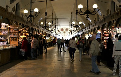 かつて織物の取引が行われた場所なので、今でも織物会館 (Sukiennice) と呼ばれています。1階部分にはお土産物屋さんがずらりと並んで楽しいです。ポーランドは地方によって民族衣装や伝統工芸が異なります。