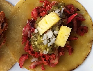 タコスの王様カルニータスに、肩を並べる人気を持つのがタコス・アル・パストル(Tacos al pastor) 。レバノン系の移民達が広めたアラブ風タコスで、もの凄い勢いでメキシコ人の胃袋を魅了しました。パイナップルが入るのが大きな特徴で、スパイスと甘さのバランスが絶妙です。