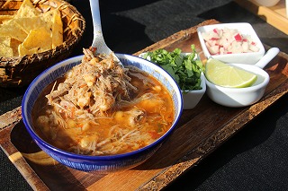 アステカ時代から受け継がれているメキシコの伝統料理がポソレ (Pozole) と呼ばれるコーンを主体とした具沢山の豚骨スープのような食べ物。ただコーン以外の野菜は肉と一緒に煮込むのではなく、生の状態で食べる直前に混ぜます。