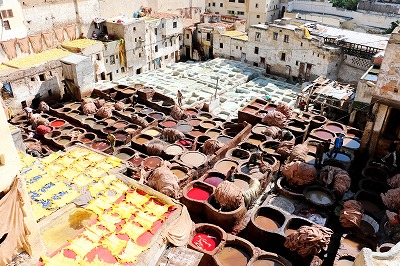 世界最大のメディナの中には、モロッコ最大のタンネリがあります。タンネリとは皮をなめして染める職人地域の作業場のこと。動物の皮から毛や皮下組織を取り除き、処理をして柔らかくすることで皮をなめし、染色液の入ったカラフルな桶に皮を漬け込んで染め上げます。