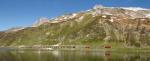 緑の山肌にところどころ赤くなっているのは、スイス三大名花で「アルプスの花の女王」と呼ばれるアルペンローゼの群生です。バラと名付けられていますがツツジ科に属する花で、スイスアルプスの至るところで見ることが出来ます。