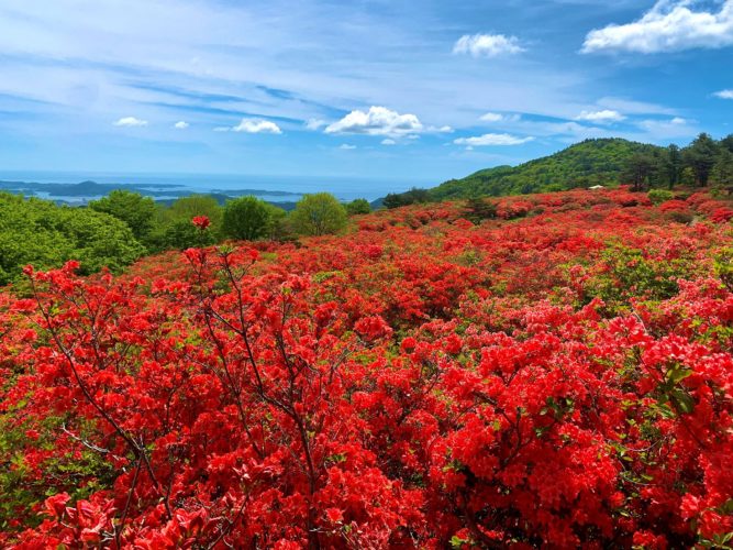 絶景ポイント: 山頂からは、真っ赤なツツジ越しに気仙沼湾(リアス式海岸)の深い青を一望できます。