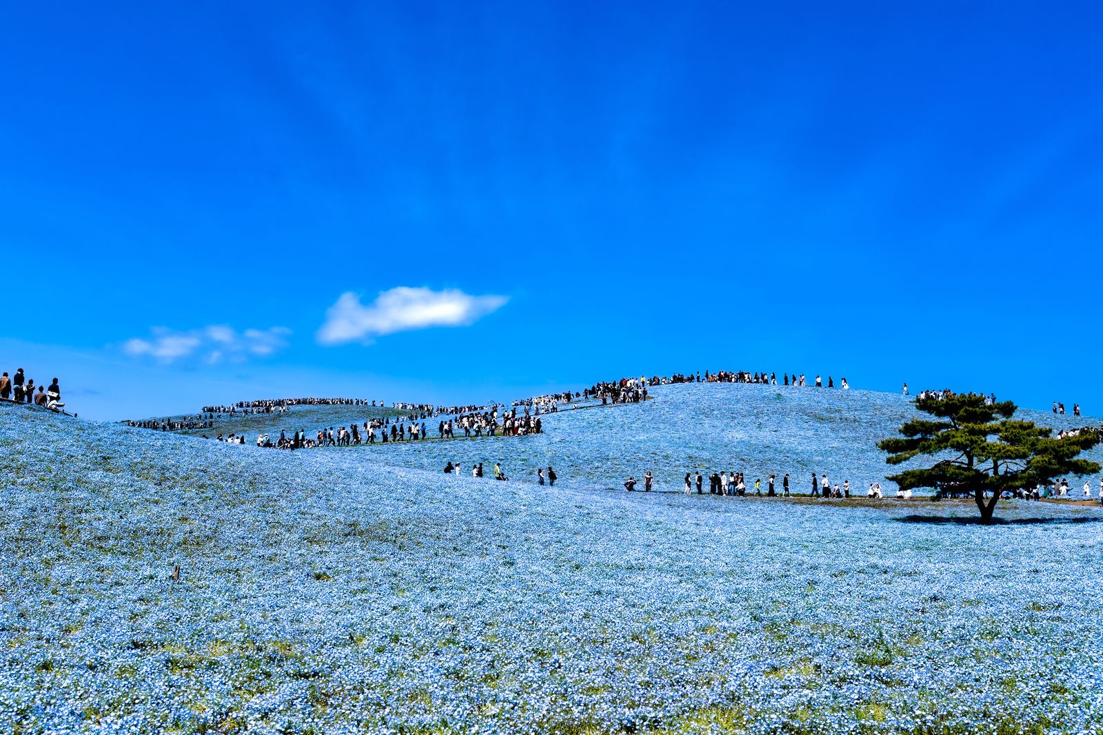茨城県ひたちなか市にある「国営ひたち海浜公園」のネモフィラは、2026年もその圧倒的なスケールで訪れる人々を魅了します。約3.5ヘクタールの「みはらしの丘」を埋め尽くす約450万本のネモフィラは、まさに日本一の規模。北アメリカ原産の「ネモフィラ(和名:瑠璃唐草)」が織りなすライトブルーの絨毯は、海と空の青が一体となる「オールブルー」の世界を作り出します。
